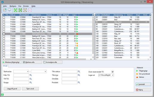 Reservering respektive förrådsuttag kan göras antingen manuellt eller automatiskt. Delrapporteringar kan göras under tillverkningens gång. Har ett mindre antal tillverkats än planerat, kan återstående material återföras. Även material och operationer som inte finns med i strukturen kan rapporteras och kommer då med i efterkalkylen. Tillkommande kostnader från leverantörer kan också påföras.
