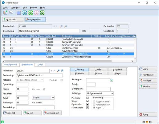 Produkterna byggs upp i strukturer bestående av material, halvfabrikat och operationer. Halvfabrikaten kan i sin tur skapas på samma sätt. Strukturerna kan byggas upp i flera nivåer. Som ett hjälpmedel finns Ingår-i-analys med utbytesmöjlighet.