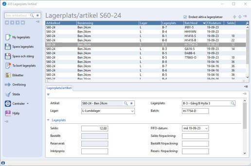 Med Lagerplatser/Batch kan du placera flera artiklar på samma lagerplats och ha en artikel inlagd på flera lagerplatser, så kallade flytande lagerplatser. Lika effektivt hjälper modulen dig att spåra varor med batchinformation. Modulen innehåller även stöd för verksamheter som baserar sig på lagerhotell.