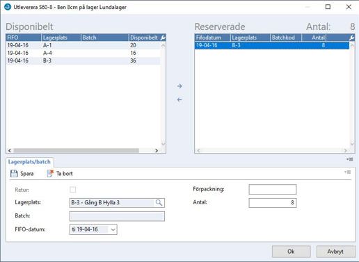 Vid inleverans anges information om lagerplats/batch och batchar kan automatiskt spärras för utleverans innan de har kvalitetskontrollerats. Vid utleverans anges från vilken lagerplats/batch uttaget gjorts. Tillgängliga lagerplatser/batcher visas i FIFO-ordning, det vill säga de äldsta föreslås först.
