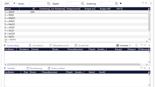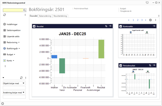 Skräddarsy resultatrapporter per varugrupp eller kör ut projektlistor från redovisningen. Ett utökat antal förinställda listor och rapporter ingår. Det ingår även en prognoslista som tar hänsyn både till budget och hittillsvarande utfall under året. Välj mellan utfall & budget eller utfall & korrigerad budget.