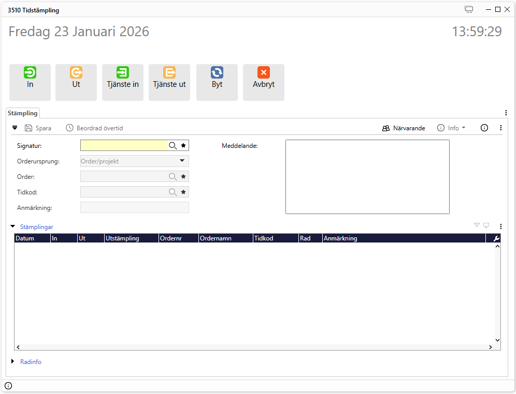 Med rätt inställningar krävs endast signatur, ordernummer och tidkod – vilket gör tidrapporteringen snabb, korrekt och lättillgänglig.