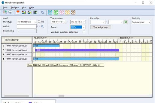 Alla hyresartiklar som är individhanterade kan bokas via en översiktsgraf. Här får man en tydlig bild över alla individer och när man valt hyresobjekt kan man direkt se vad som finns ledigt.